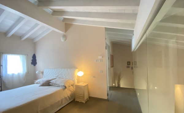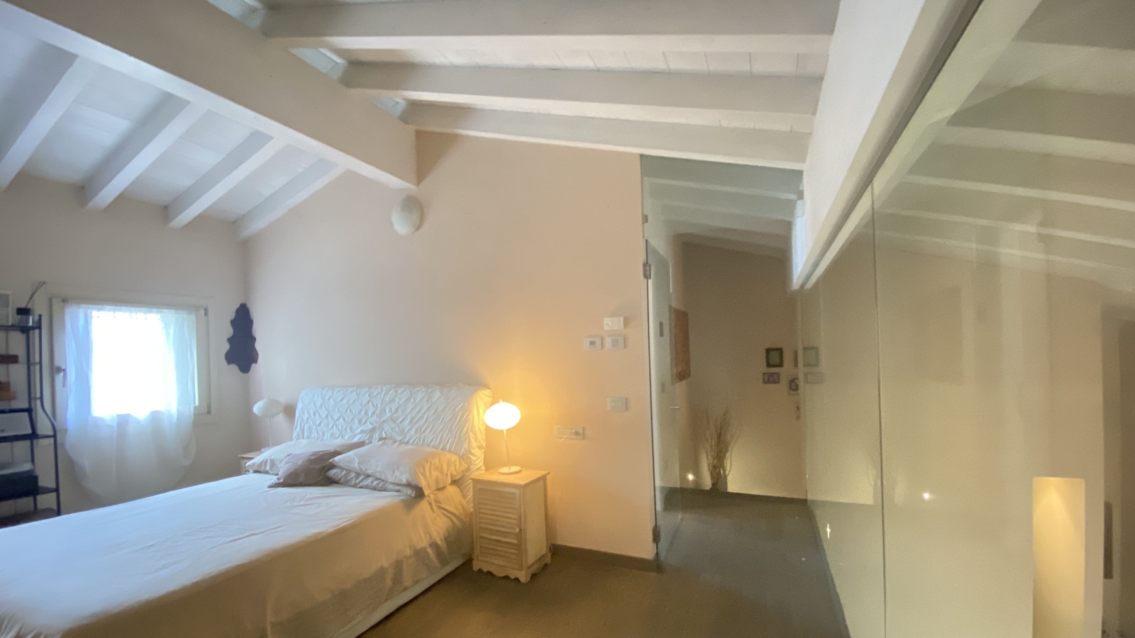 Il piano primo è dotato di travi in legno sbiancate e pareti in vetro che si affacciano sulla zona living.